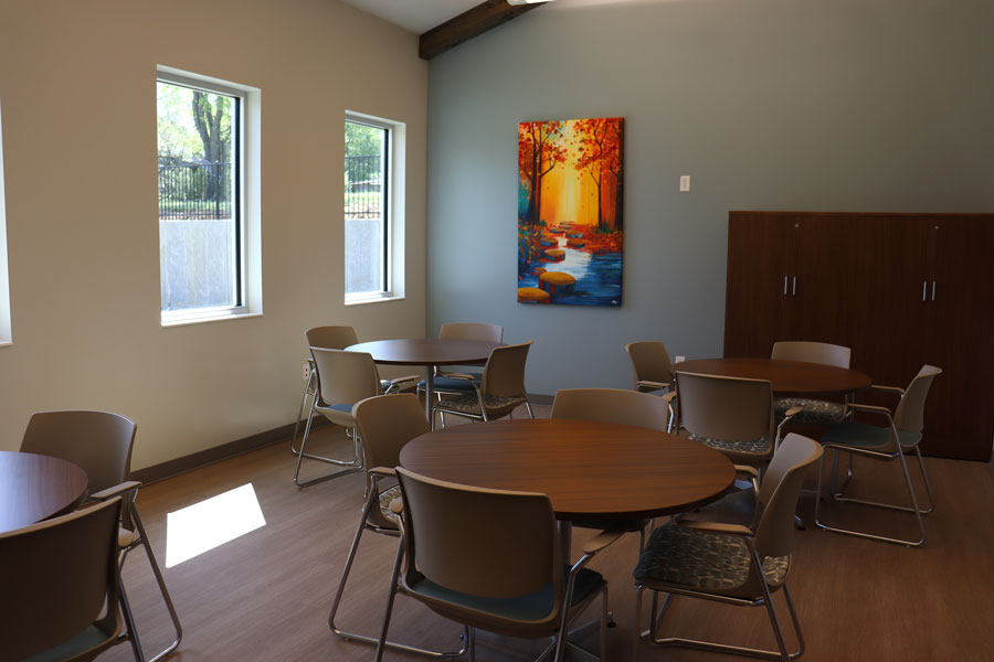 The Clarksville branch serves close to 50 members in a therapeutic communities setting that includes group homes and apartments, as well as a newly constructed program center which opened in April 2025. The new facility is more than 13,000 square feet, beautifully decorated with member artwork, spacious dining and program rooms, large offices for group therapy, exercise room, family room, and expressive arts studio.